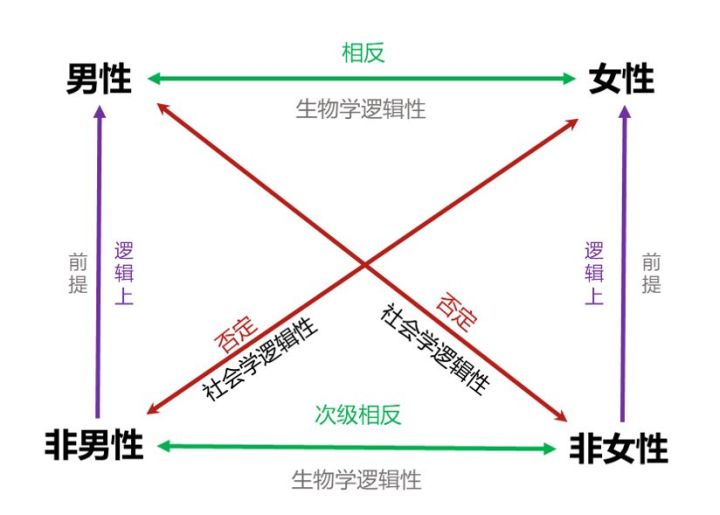 下面以“男性”和“女性”这两个相对的概念来举个例子,注意其中错综复杂的逻辑关系/类型。
