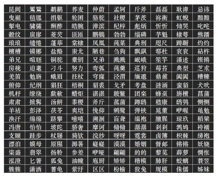 - 复合式(A+B等于C):由两个字组成,这两个字分别代表意义,组成双音节的词,这类词出现的频次最多。比如,弟兄、砧杵、纪纲、捐躯、巡狩、犬吠。